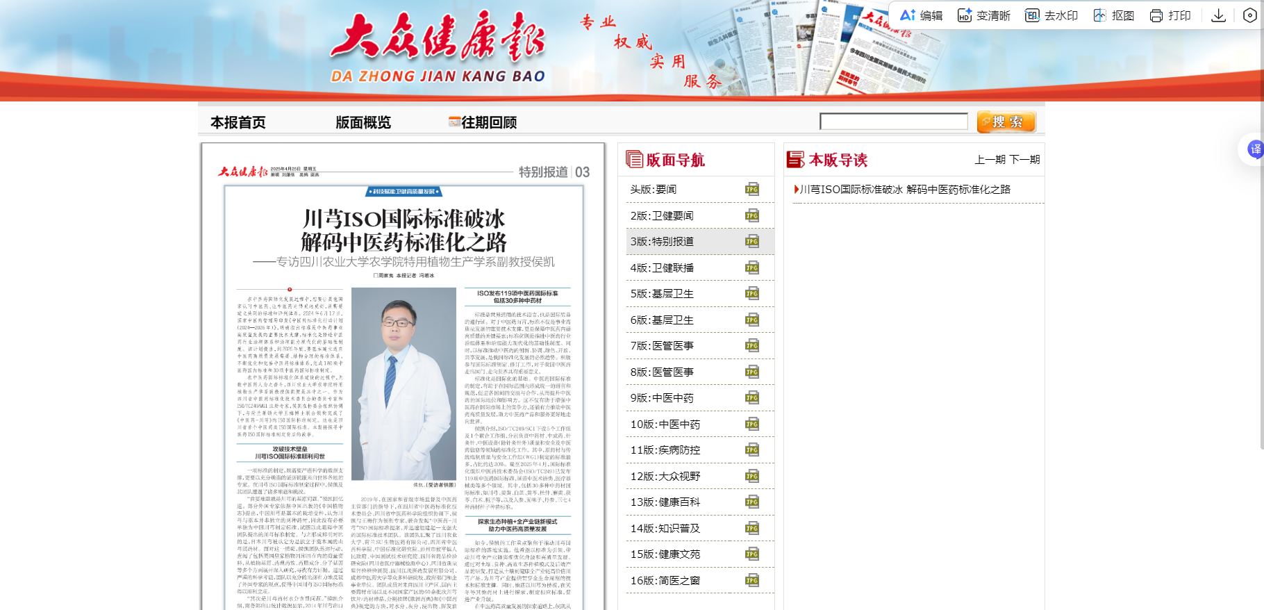 在中医药高质量发展的探索道路上,侯凯从未停歇。目前,他和团队正在研究优选抗病高产良种,探索“良种+良法”打造“从土壤到健康”高品质中药材的具体做法、成果。侯凯介绍,他们团队在中药资源普查与评价基础上,成功选育出白芷、紫苏等中药材新品种,并制定了配套的优质高产栽培管理规程。例如推广白芷减氮增菌技术、药稻药水旱轮作生态种植模式等。此外,团队以“农产品健康化、中药生活化”为抓手,打造“从土壤到健康”的高品质产品,开发出“川芎芽苗”系列、桑叶健康饼干、紫苏饮料、芦笋健康饮、油菜花粉健康食品等特色产品,实现农业产业链条健康转化与价值升级。