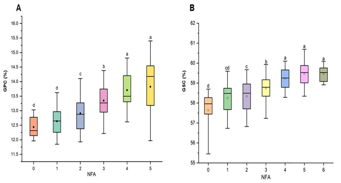 聚合效应分析表明,在本研究中发现的5个和蛋白质含量相关的QTL,只要在某一株系中任意出现0-4个时,蛋白质含量均会显著增加,而本研究中发现的6个和淀粉含量相关的QTL,只要在某一株系中任意出现0-4个时,淀粉含量也会显著增加,呈现了典型了聚合效应。