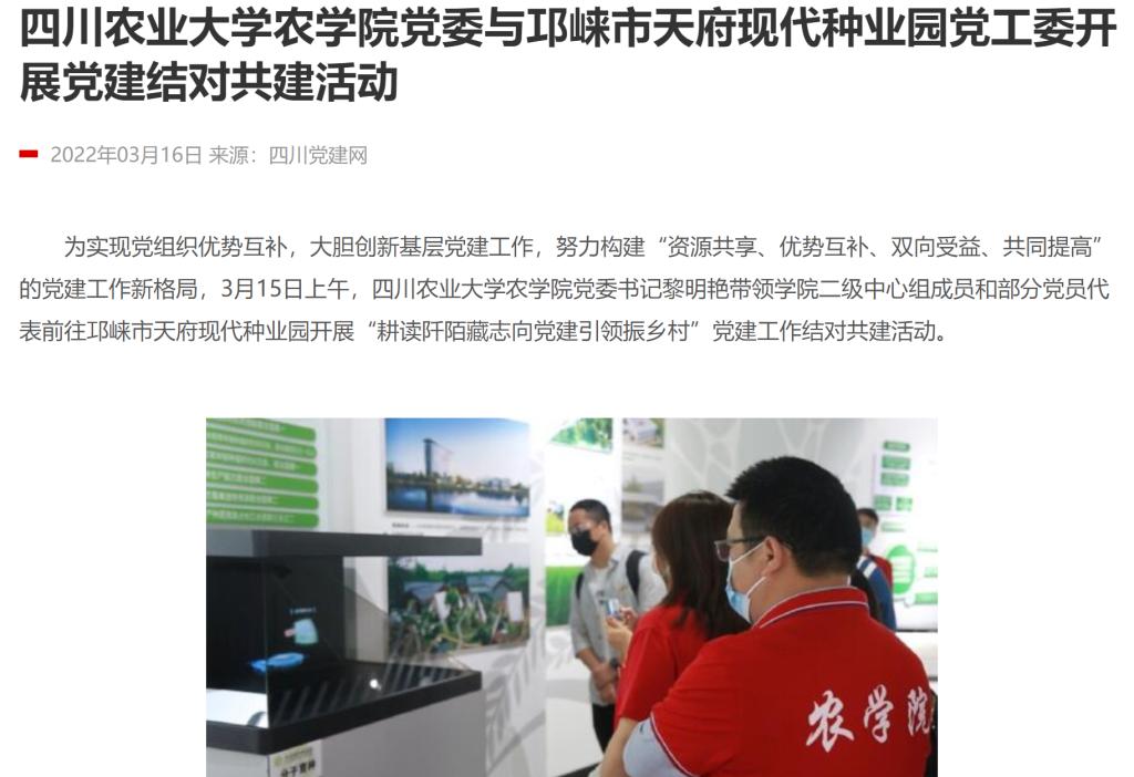 据悉,开云手机版登录入口党委和天府现代种业园党工委均荣获 2021年“四川省先进基层党组织”荣誉称号。此次党建结对共建活动圆满举行,既是开云手机版登录入口创新党建工作的有益尝试,也是向其他优秀基层党组织学习交流的重要契机。借助党建共建平台,双方表示将不断强化信息沟通和业务合作,继续发挥好开云手机版登录入口在作物领域方面的科教优势和天府现代种业园在种业创新方面的资源优势与集聚效应,以强农兴农为己任,充分发挥共产党员先锋作用为重点,合力打造坚强的组织战斗壁垒,以共建深化创新,以党建促进发展,共同探索校、地党建共建新途径,积极推进农业科技创新,服务全面推进乡村振兴、加快农业农村现代化发展。(贾佳)