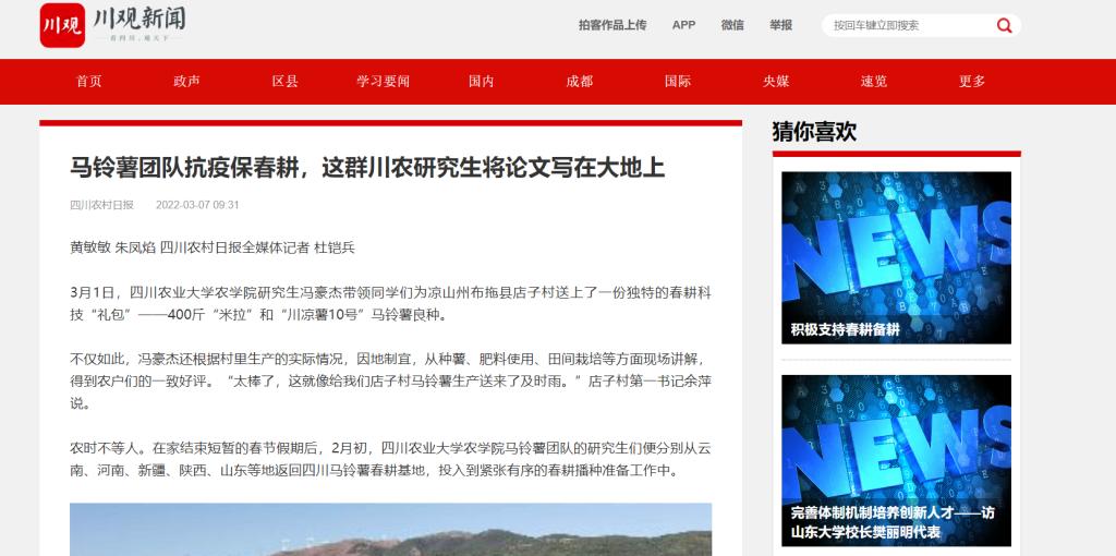 在雷波县,早在1月,团队师生从四川农业大学赴雷波开展定点帮扶工作团队了解到当地有马铃薯种薯、生产技术等科技服务的需求后,立即与学校派驻雷波县大杉坪村的驻村干部祖立义老师联系展开帮扶。就在春播前,大杉坪村急需的马铃薯脱毒良种“川凉薯10号”“米拉”“云薯108”和“布拖乌洋芋”送到了农户手中,确保了该村今年的马铃薯新品种引种示范启动。
