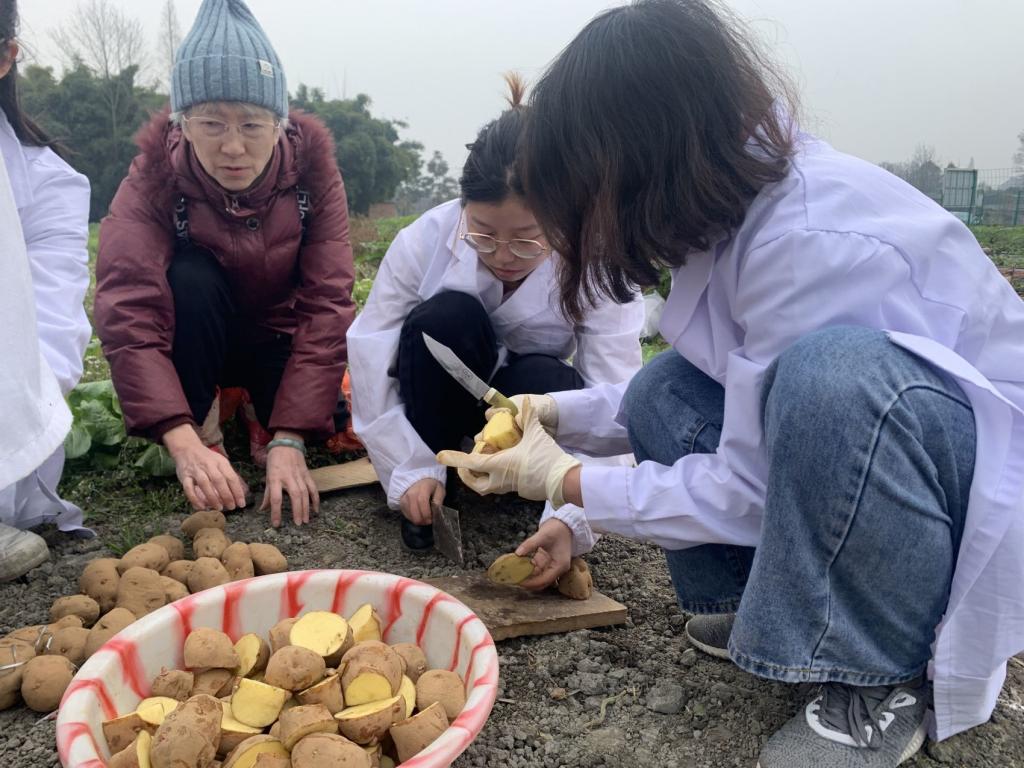 1月5日,位于成都市温江区的土豆栽种现场2亩试验田里,因团队成员切割高原种薯块茎,空气中一直弥漫着高原土豆特有的、“阳光”的清新香气。为什么要把高原土豆品种栽种到平原地区呢?四川农业大学科技小院导师团队成员严奉君博士后解答了记者的疑惑。
