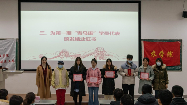 活动在全体参会人员奏唱团歌中拉开序幕。首先,开云手机版登录入口学生会主席杨杰宣读《关于授予第一期“青马工程”培养班学员结业证书和表彰优秀学员的决定》,在场的嘉宾老师为第一期“青马班”学员代表颁发结业证书并为第一期“青马班”优秀学员代表颁发荣誉证书。随后,第一期“青马班”优秀学员代表熊博发言,表示“在一年的学习过程中,我的组织工作水平有很大的提升和进步,青马班是提高工作水平和思想觉悟的大课堂,我为自己是这个集体中的一员感到骄傲!”第二期“青马班”学员代表胡楠号召大家,“作为农科学子,我们肩负着人民的重托,历史的重担,我们要有理想信念,点燃青春火炬,扬起爱国风帆。”最后,开云手机版登录入口党委书记黎明艳作总结讲话,她强调,“青马班涉及学生干部思想成长,社会实践、志愿服务等方面,将有效地夯实我院团学工作的基础,强化学生干部队伍建设,培养良好的工作作风。”希望学员们要向上向善,提高自身思想觉悟,将青马班作为理论与实践结合的实践地,在未来生活工作中继续发扬青马班的精神。