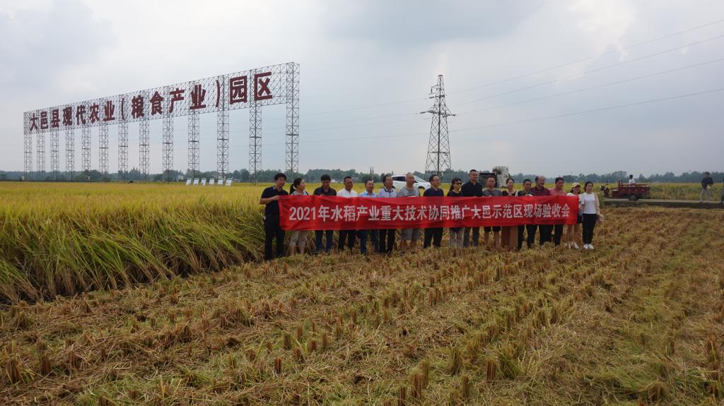 与会领导和专家组现场考察了大邑县旭成农作物种植合作社的1400亩麦茬迟栽杂交稻核心示范片和全县的1.6万亩示范区,并在核心示范片选择有代表性田块进行全田机械实收测产,并采用高精度GPS和人工测量反复校准面积。经验收,该示范片加权平均亩产为741.5公斤,最高亩产达807.8公斤,创下了优质稻迟栽提质生产的产量新高。经测算,万亩示范区水稻优质化率和耕种收综合机械化率均达到100%,氮肥利用效率提高12.8%,生产效率提高27.3%,亩节本增效309.5元。专家组认为,示范区建立的“一站两主体三中心四协同”的协同推广机制高效实用,选用的晶两优534、宜香优2115、川康优2115、川康优丝苗等品种丰产优质食味值高,保优提质和全程机械化生产2项技术落实效果好。川农大与成都市农林科学院、大邑县农业农村局、新型经营主体“多元主体高效协同”进行了上下贯通,左右衔接,线下线上互动的高效推广,经营主体对新技术接受快,满意度高,技术对水稻产业贡献度大。