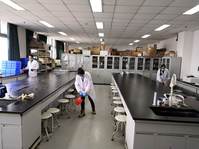 检查组仔细查看了各实验室内外的地面、实验台面、水、电、消防器材、危化品管理、超低温冰箱等设备运行情况、记录台账等,与实验管理人员确认了实验室防疫卫生消杀情况。通过近两个小时的现场检查,整体效果良好。各实验室均用84消毒液对实验室地面、桌面、室内空气等进行了消毒处理,保障了实验室的环境安全;实验室物品、试剂等均规范放置,整体环境保持良好。在检查过程中发现存在的问题,均现场进行了规范处理。