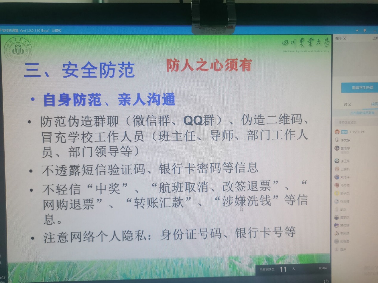 植保18-3班班主任杨春平老师通过ppt讲解防骗事项