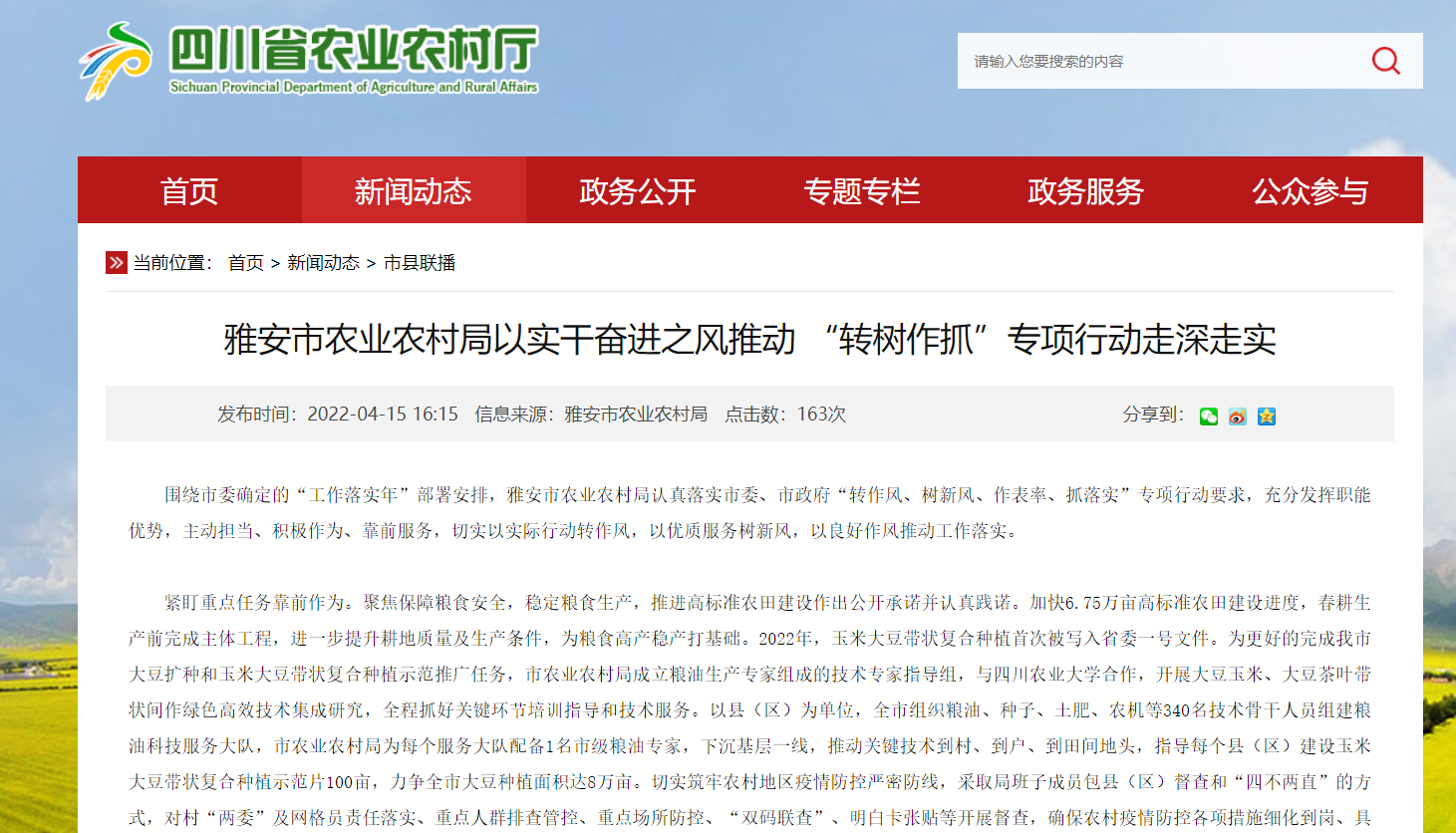 围绕市委确定的“工作落实年”部署安排,雅安市农业农村局认真落实市委、市政府“转作风、树新风、作表率、抓落实”专项行动要求,充分发挥职能优势,主动担当、积极作为、靠前服务,切实以实际行动转作风,以优质服务树新风,以良好作风推动工作落实。