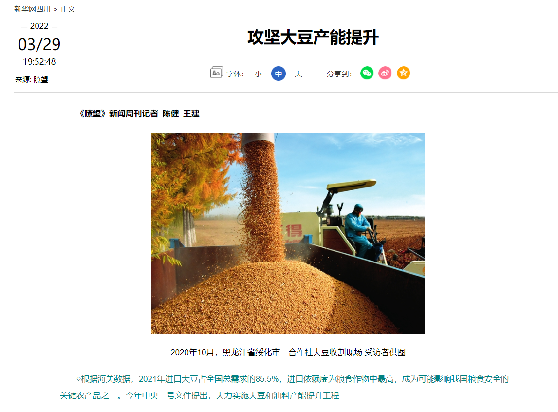 ◇根据海关数据,2021年进口大豆占全国总需求的85.5%,进口依赖度为粮食作物中最高,成为可能影响我国粮食安全的关键农产品之一。今年中央一号文件提出,大力实施大豆和油料产能提升工程