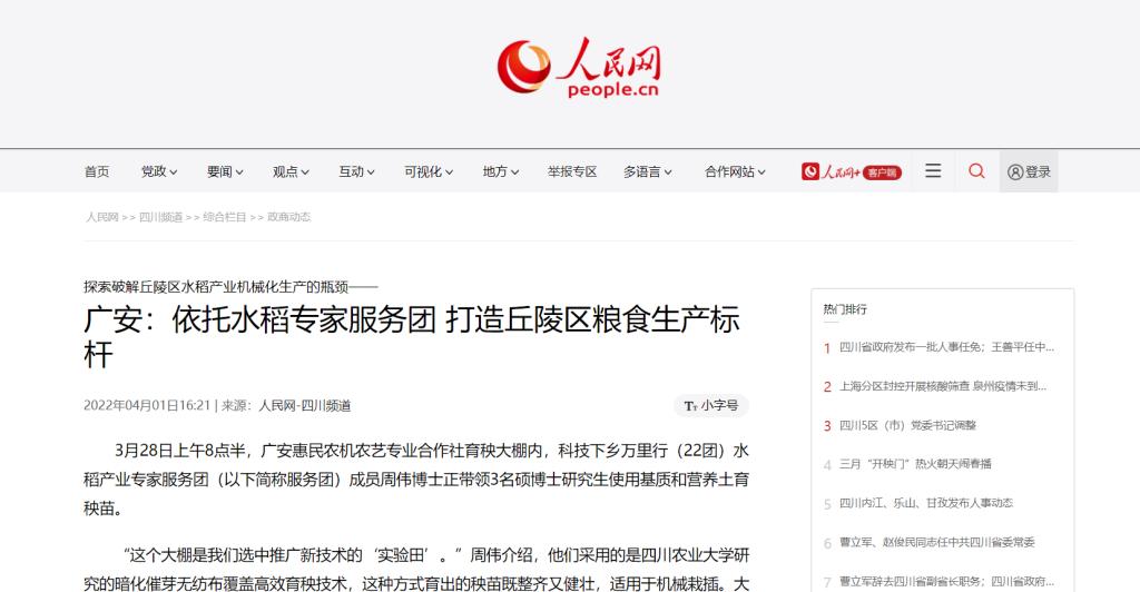 “农业现代化的根本出路在于机械化,经过团队十多年的研究实践,总结的全套水稻机械化种植技术已经相当成熟,适宜在广安等丘陵地区推广。”服务团首席专家、四川农业大学教授任万军表示,打造丘陵区粮食生产标杆,让种植户从对比中找到差距和提高效益的途径,从而激发他们生产粮食的积极性和主动性。