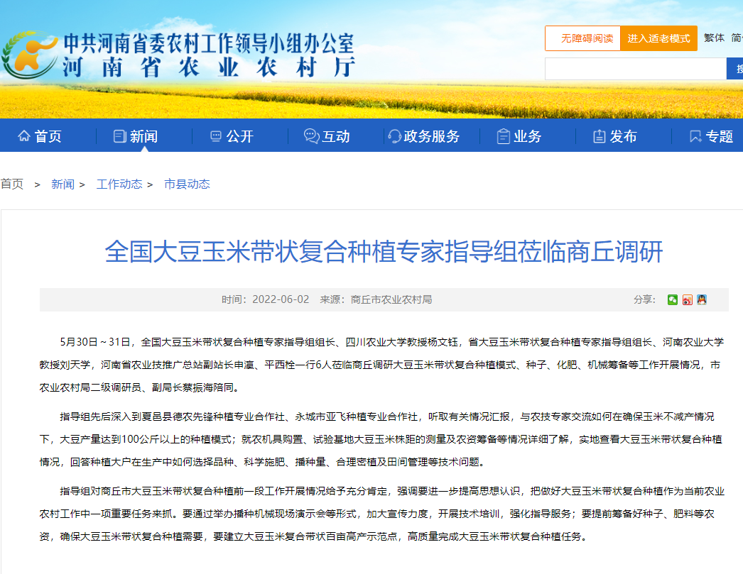 5月30日~31日,全国大豆玉米带状复合种植专家指导组组长、四川农业大学教授杨文钰,省大豆玉米带状复合种植专家指导组组长、河南农业大学教授刘天学,河南省农业技推广总站副站长申瀛、平西栓一行6人莅临商丘调研大豆玉米带状复合种植模式、种子、化肥、机械筹备等工作开展情况,市农业农村局二级调研员、副局长蔡振海陪同。