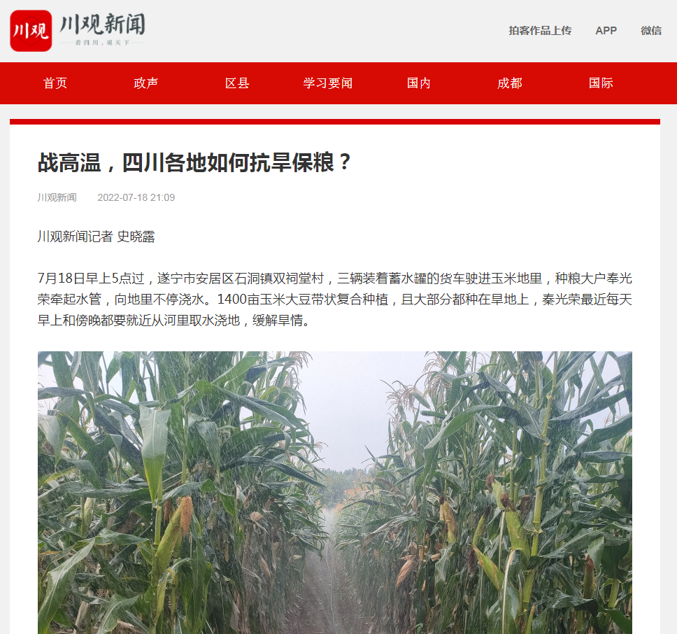 7月以来,四川大部分地区出现持续高温晴热天气,局部地区超过40℃。当前水稻、玉米、大豆等大春粮食作物已进入产量形成的关键时期。大春粮食产量占全年粮食的八成以上,是全年粮食生产的重头戏。如何应对高温天气?