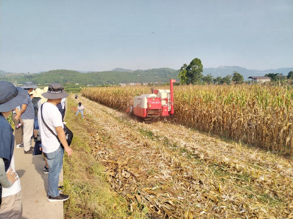 与会人员现场观摩了我校开云手机版登录入口玉米生理生态与高效栽培团队研发的玉米全程机械化丰产高效生产技术及与中江县农业农村局、中江县惠农粮食专业合作社协同开展的技术示范应用样板。袁继超现场详细讲解了多年研发形成的密植高产宜机品种筛选、精量机播保苗壮苗、无人机植保和适时机械粒收等玉米全程机械化关键技术,实现了农机农艺有效融合、绿色丰产高效协同。