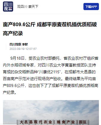 9月18日,受农业农村部委托,省农业农村厅组织省内外水稻领域专家,对四川农业大学黄富教授团队主持育成的杂交稻新品种“川康优2115”,在成都市大邑县的百亩高产示范片进行现场测产验收。最终结果为平均亩产809.6公斤,这也创下了了成都平原麦茬机插优质稻高产纪录。