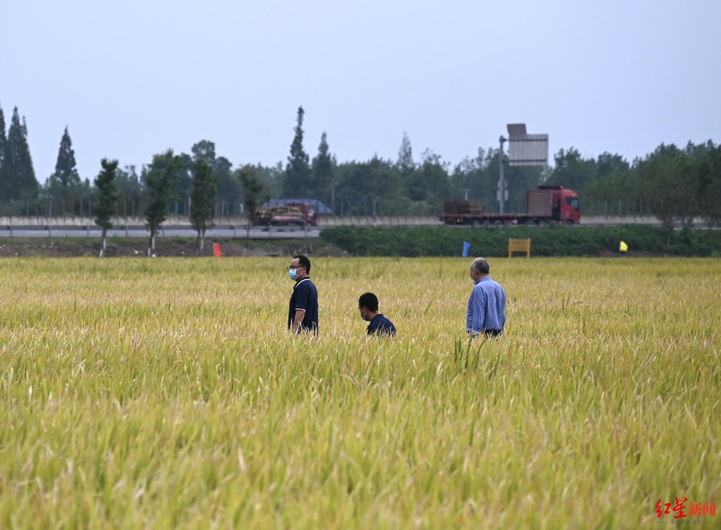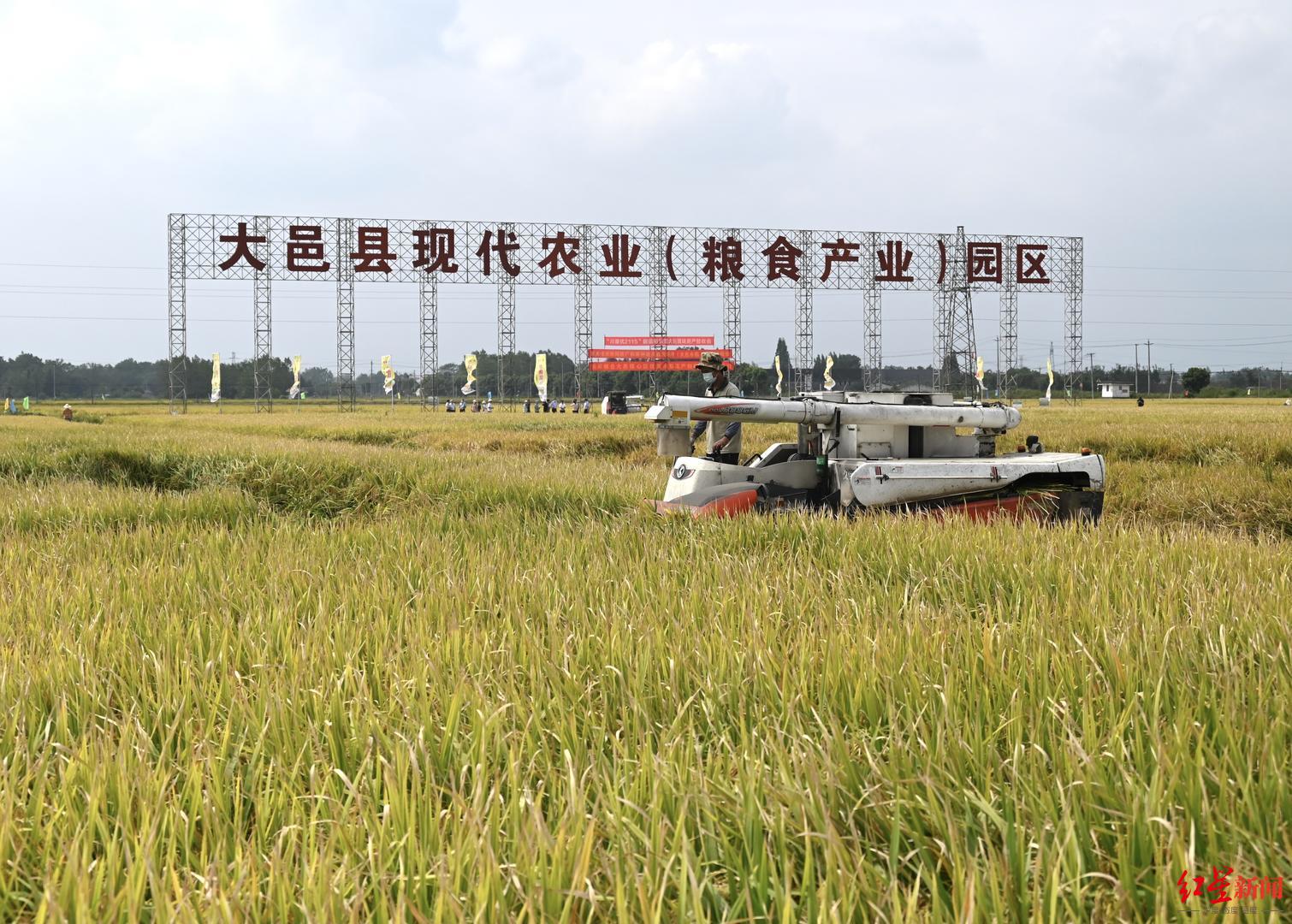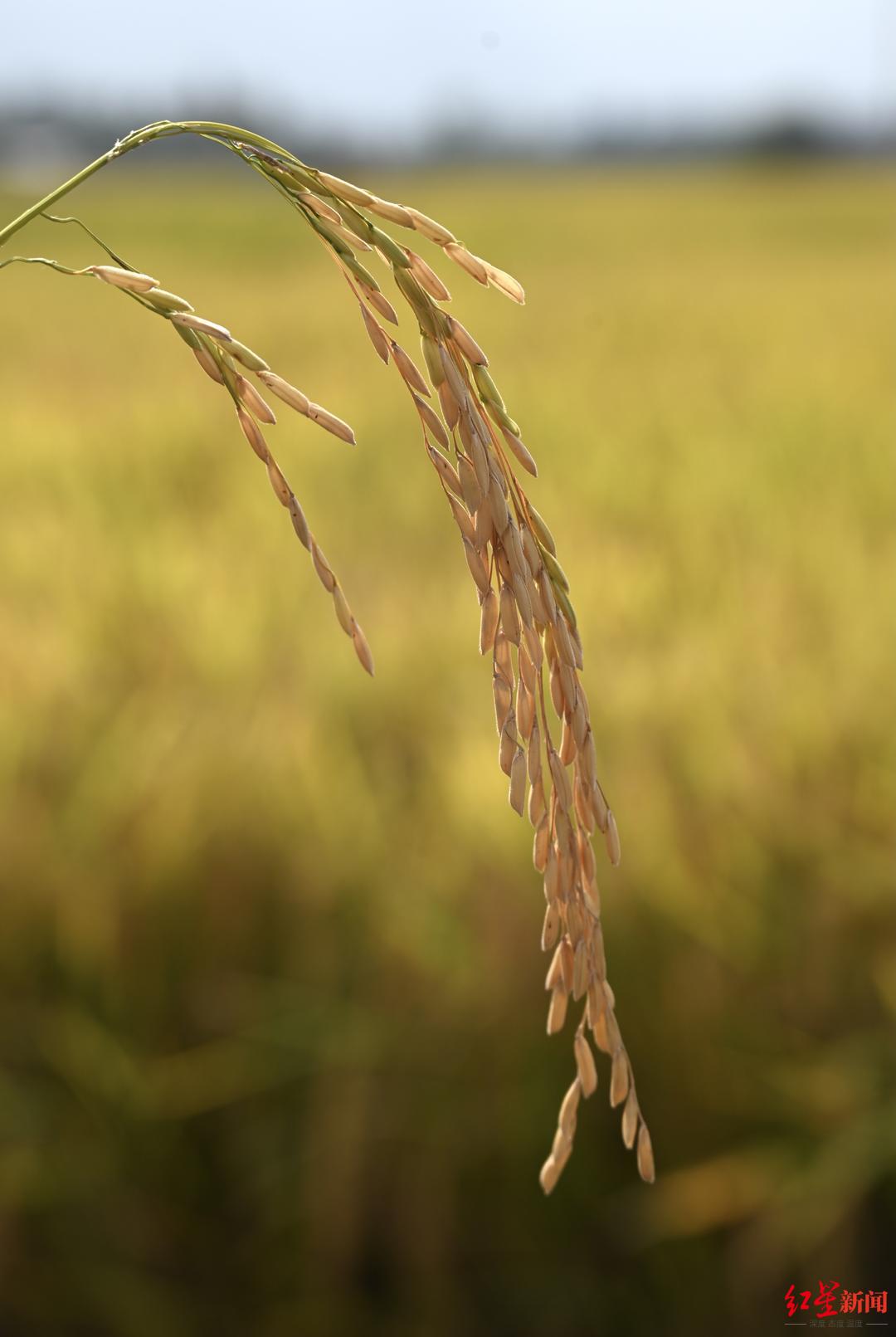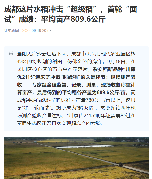 当阳光穿透云层洒下来,成都市大邑县现代农业园区核心区即将收割的稻田,仿佛金色的海洋。9月18日,在该园区核心区的百亩高产示范片,杂交稻新品种“川康优2115”迎来了冲击“超级稻”的关键环节:现场测产验收——专家组全程监督、记录、测量,现场收割称重计算亩产,最后得到的平均稻谷产量为809.6公斤/亩。而成都平原“超级稻”的标准为产量780公斤/亩以上,这只是“第一轮面试”。想要成为“超级稻”,需要连续两年现场测产验收产量达标。“川康优2115”明年还需要经过在不同生态区能否再次实现超高产的考验。