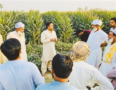 在巴基斯坦旁遮普省巴哈瓦尔布尔,穆罕默德·阿里·拉扎(中)在向村民介绍玉米—大豆带状复合种植技术。 穆罕默德·阿里·拉扎供图