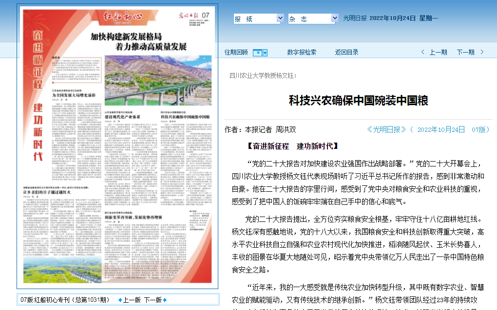 “科技是第一生产力,党的二十大报告非常重视科技创新。新的起点上,我们将以党的二十大精神为指引,继续以强农兴农为己任,坚定不移走好科技兴农之路,确保中国碗装中国粮。”杨文钰说。