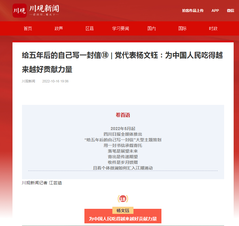 杨文钰,四川农业大学教授,全省510多万共产党员中的优秀代表,肩负着全省党组织和党员重托,赴京出席党的二十大。
