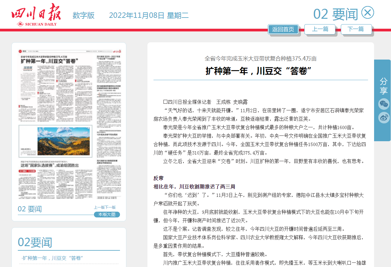 奉光荣扩种大豆的举措,与中央部署有关。年初,中央一号文件明确在全国推广玉米大豆带状复合种植,而此项技术发源于四川。今年,全国玉米大豆带状复合种植任务1500万亩,其中,下达给四川的“硬任务”是310万亩,最终全省完成375.4万亩。