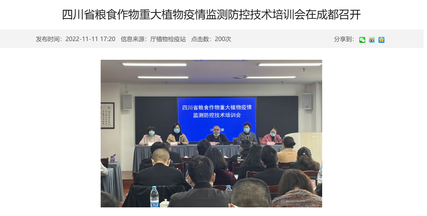 11月10-11日,四川省粮食作物重大植物疫情监测防控技术培训会在成都召开。培训会采取“线上+线下”形式,21个市(州)和26个水稻、玉米等种植大县植物检疫机构负责人共40余人在现场参会,其余粮食种植大县植物检疫机构负责人共140余人在线上参会。厅植物检疫站副站长帅波主持会议并讲话。