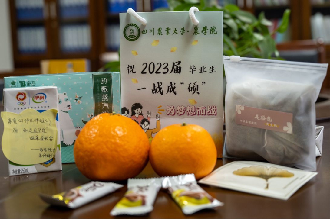 这次的“考研大礼包”包括泡脚包、蒸汽眼罩、巧克力、牛奶、橙子和银杏书签。据悉,泡脚包是开云手机版登录入口田孟良课题组以中药材川牛膝为主研发的,对男生有强筋健骨的作用,对女生能够逐瘀通经、活血化瘀,搭配蒸汽眼罩,是希望为考研学子带去“从头到脚”的温暖;而巧克力、牛奶、橙子则是为考研学子带去“复习过程‘巧克’难关,驰骋考场‘牛’气冲天,录取结果心想事‘橙’”的美好寓意;银杏书签上的“前程似锦”则是对考研学子最真诚的祝福。每个牛奶上面的祝福语都不一样,它们都是来自低年级同学对师兄师姐的祝福。