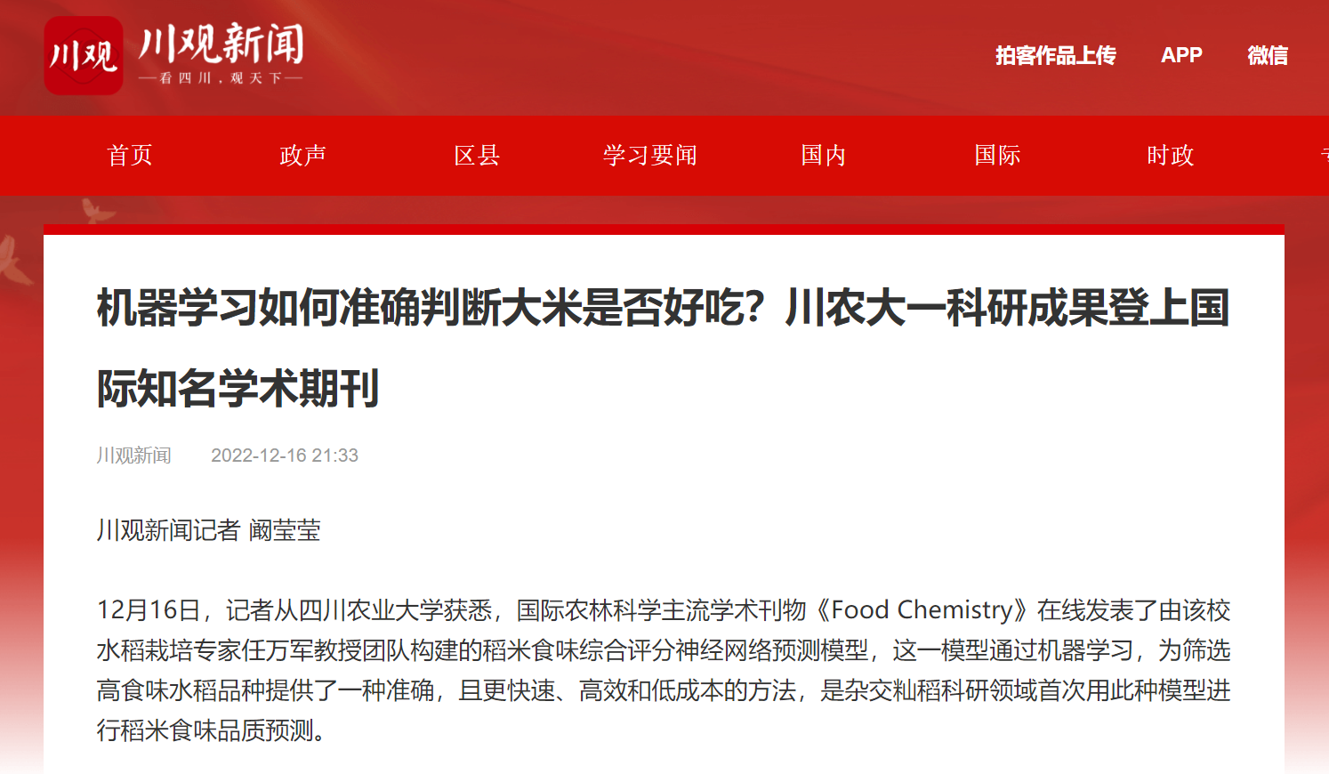 12月16日,记者从四川农业大学获悉,国际农林科学主流学术刊物《Food Chemistry》在线发表了由该校水稻栽培专家任万军教授团队构建的稻米食味综合评分神经网络预测模型,这一模型通过机器学习,为筛选高食味水稻品种提供了一种准确,且更快速、高效和低成本的方法,是杂交籼稻科研领域首次用此种模型进行稻米食味品质预测。