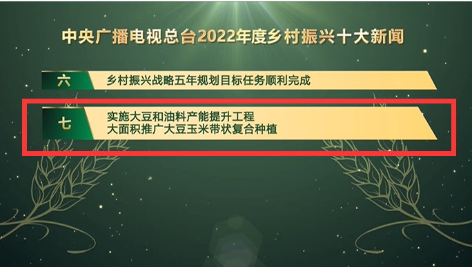 近日,中央广播电视总台发布2022年度乡村振兴十大新闻,“实施大豆和油料产能提升工程,大面积推广大豆玉米带状复合种植”新闻名列其中。