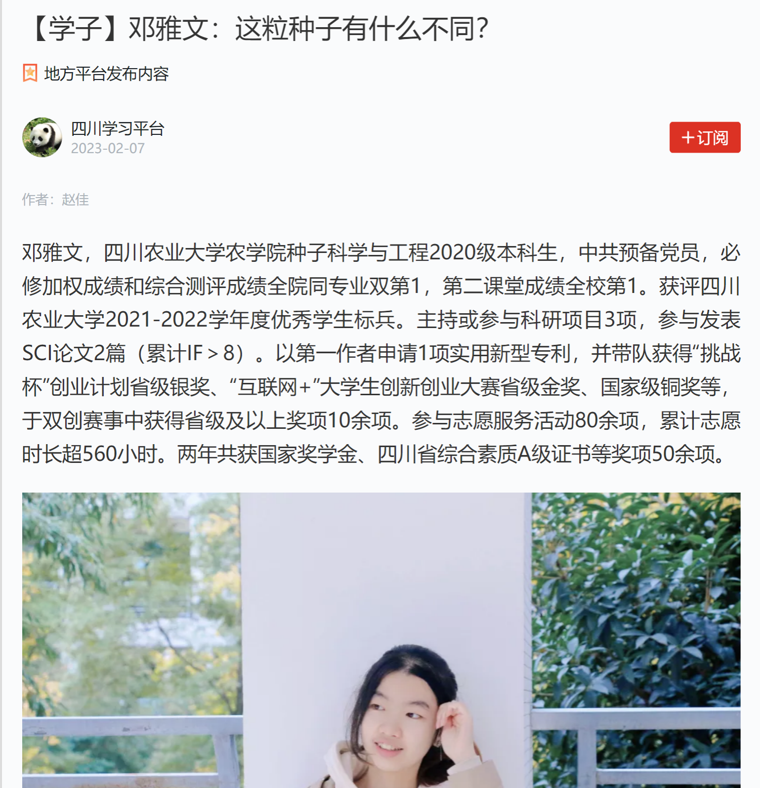 “‘种’于梦想,扎根和生长”,植物的生长从种子开始,邓雅文的成长从入校开始。在报考专业时,基于“种子”是农业芯片,又知悉到周开达、颜济等老一辈川农人的农业情怀,邓雅文受到触动,便毫不犹豫地选择了四川农业大学的种子科学与工程专业。在初入校园时,她还略显青涩,但经过两年的吸收沉淀,她呈现出她自己的色彩,在31门必修课中有27门必修课90+。