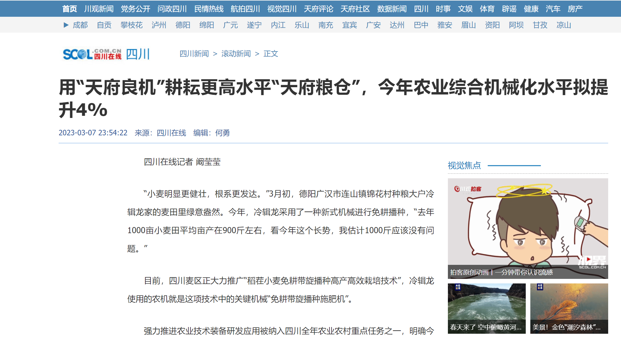 (四川在线)用“天府良机”耕耘更高水平“天府粮仓”,今年农业综合机械化水平拟提升4%