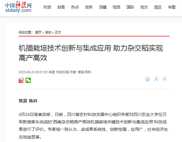 4月24日笔者获悉,日前,四川省农村科技发展中心组织专家对四川农业大学任万军教授牵头完成的“西南杂交稻高产高效机插栽培关键技术创新与集成应用”科技成果进行了评价。专家组一致认为,该成果系统性、创新性强,应用广,社会经济生态效益显著。