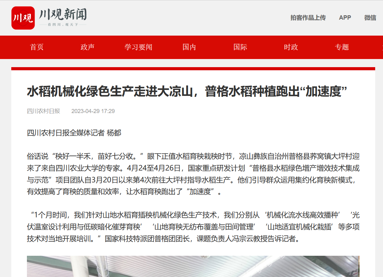 俗话说“秧好一半禾,苗好七分收。”眼下正值水稻育秧栽秧时节,凉山彝族自治州普格县荞窝镇大坪村迎来了来自四川农业大学的专家。4月24至4月26日,国家重点研发计划“普格县水稻绿色增产增效技术集成与示范”项目团队自3月20日以来第4次前往大坪村指导水稻生产。他们引导群众运用集约化育秧新模式,有效提高了育秧的质量和效率,让水稻育秧跑出了“加速度”。“1个月时间,我们针对山地水稻育插秧机械化绿色生产技术,我们分别从‘机械化流水线高效播种’‘光伏温室设计利用与低碳暗化催芽育秧’‘山地育秧无纺布覆盖与田间管理’‘山地适宜机械化栽插’等多项技术对当地开展培训。”国家科技特派团普格团团长,课题负责人冯宗云教授告诉记者。