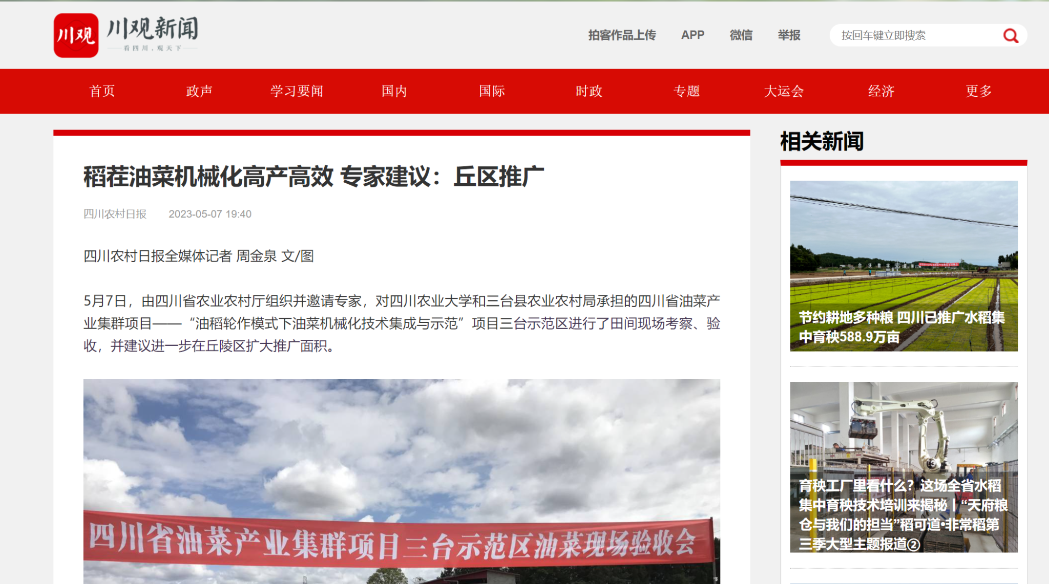 5月7日,由四川省农业农村厅组织并邀请专家,对四川农业大学和三台县农业农村局承担的四川省油菜产业集群项目——“油稻轮作模式下油菜机械化技术集成与示范”项目三台示范区进行了田间现场考察、验收,并建议进一步在丘陵区扩大推广面积。