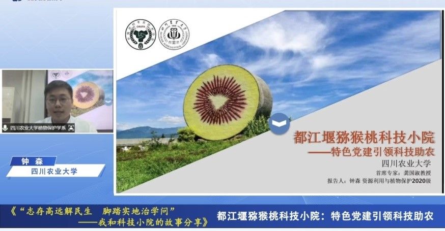 钟森以“特色党建引领科技助农”为主题对都江堰猕猴桃科技小院的建设进行分享。都江堰猕猴桃科技小院成立于2020年9月8日,由开云手机版登录入口植物保护学系专家团队带领科技人员、研究生长期驻扎农村和生产第一线,以猕猴桃病害综合防控为主战场,开展科技创新、技术服务,围绕当地农业生产中的问题开展科学研究,解决农民生产中的实际问题。科技小院的师生将已集成的3大技术进行推广应用,参与制作都江堰猕猴桃气象服务周报,开展病害防控田间指导,举办病害防控专题讲座,建立科普教育基地,进行病害综合防治科普宣传活动,建立新媒体科普阵地,参与成立“乡村振兴党员服务先锋队”、“都江堰猕猴桃科技小院支农助农党员先锋队”,依托小院组建科技志愿服务团队、社会实践团队、创新创业团队,以实际行动助力乡村产业振兴。钟森表示,包括其在内的12名研究生将继续紧跟科技小院专家团队的步伐,推动小院平台建设,加强研究生入驻,实现人才培养与科技实践紧密结合,同时不断加强党建引领,深入田间开展技术支农助农服务,“自找苦吃”“苦中作乐”同农户交流取长补短积累知识、积攒经验,厚植爱农情怀,练就兴农本领。