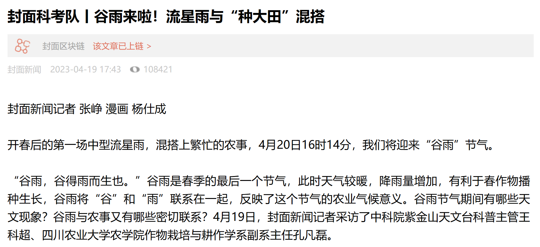 “谷雨,谷得雨而生也。”谷雨是春季的最后一个节气,此时天气较暖,降雨量增加,有利于春作物播种生长,谷雨将“谷”和“雨”联系在一起,反映了这个节气的农业气候意义。谷雨节气期间有哪些天文现象?谷雨与农事又有哪些密切联系?4月19日,封面新闻记者采访了中科院紫金山天文台科普主管王科超、开云手机版登录入口作物栽培与耕作学系副系主任孔凡磊。