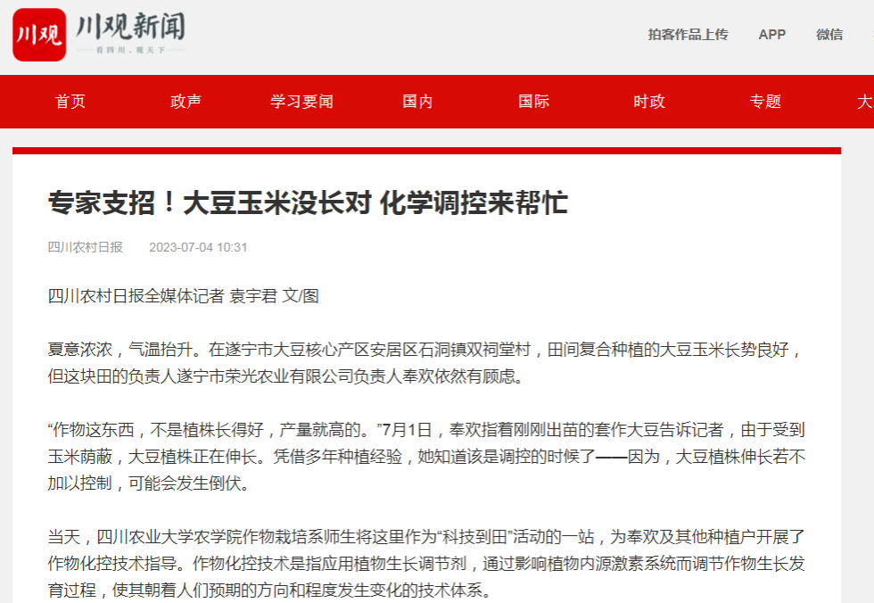 同一片田块,玉米也需要“额外关照”。四川农村日报社智库专家、四川农业大学作物栽培学与耕作学教授雍太文告诉记者,现在正处于套作玉米生长后期,正应加强管护,不仅需要科学施用营养叶面肥来壮粒,还要注重夏季的病虫害防治。结合实际情况,他与同事们帮助种植户选择了合适的化学调控剂。