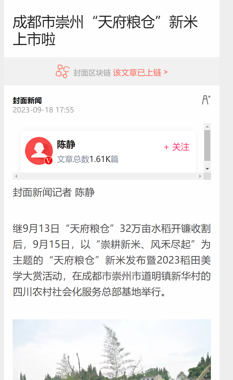 继9月13日“天府粮仓”32万亩水稻开镰收割后,9月15日,以“崇耕新米、风禾尽起”为主题的“天府粮仓”新米发布暨2023稻田美学大赏活动,在成都市崇州市道明镇新华村的四川农村社会化服务总部基地举行。