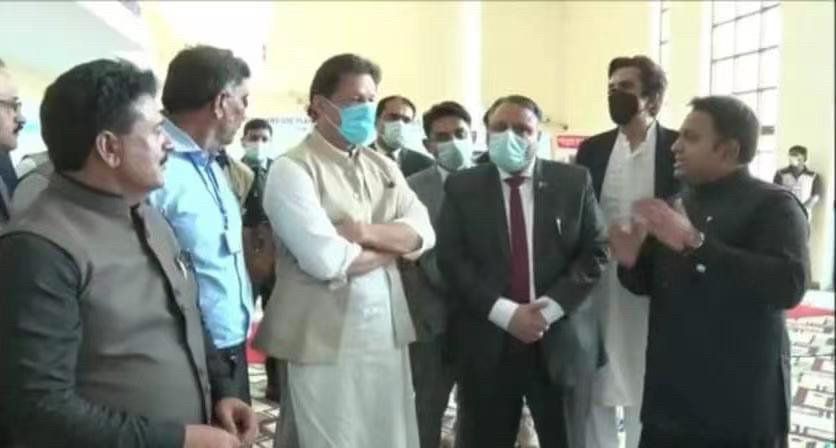 四川农业大学博士后阿里正在向巴基斯坦总理介绍玉米大豆带状复合种植技术的应用情况。
