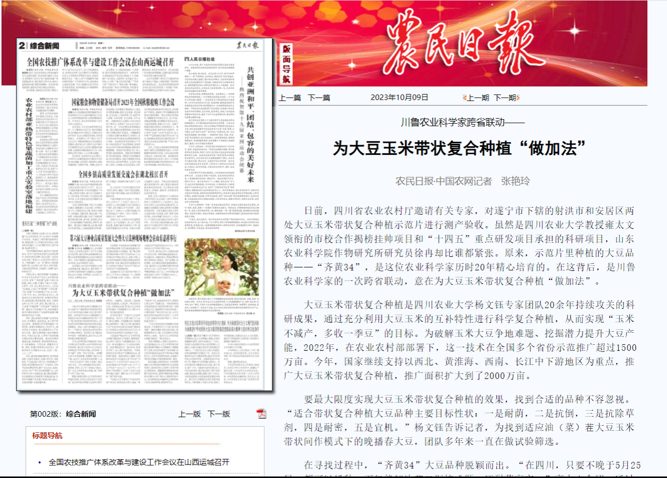 大豆玉米带状复合种植是四川农业大学杨文钰专家团队20余年持续攻关的科研成果,通过充分利用大豆玉米的互补特性进行科学复合种植,从而实现“玉米不减产,多收一季豆”的目标。为破解玉米大豆争地难题、挖掘潜力提升大豆产能,2022年,在农业农村部部署下,这一技术在全国多个省份示范推广超过1500万亩。今年,国家继续支持以西北、黄淮海、西南、长江中下游地区为重点,推广大豆玉米带状复合种植,推广面积扩大到了2000万亩。