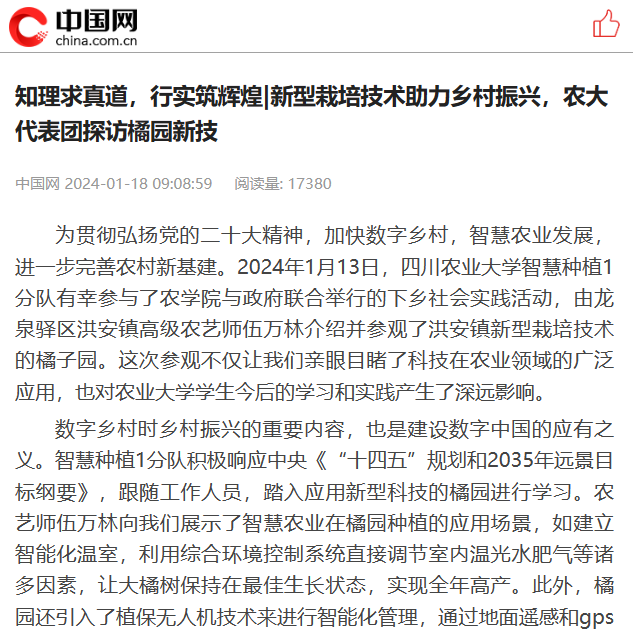 为贯彻弘扬党的二十大精神,加快数字乡村,智慧农业发展,进一步完善农村新基建。2024年1月13日,四川农业大学智慧种植1分队有幸参与了开云手机版登录入口与政府联合举行的下乡社会实践活动,由龙泉驿区洪安镇高级农艺师伍万林介绍并参观了洪安镇新型栽培技术的橘子园。这次参观不仅让我们亲眼目睹了科技在农业领域的广泛应用,也对农业大学学生今后的学习和实践产生了深远影响。