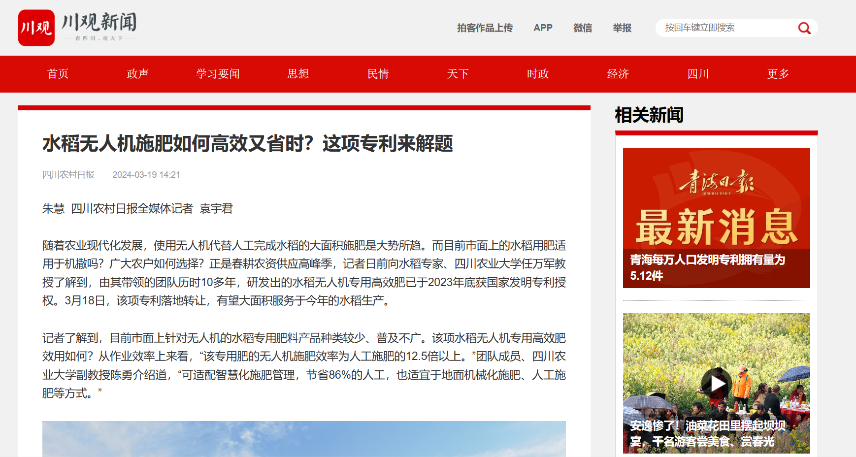 随着农业现代化发展,使用无人机代替人工完成水稻的大面积施肥是大势所趋。而目前市面上的水稻用肥适用于机撒吗?广大农户如何选择?正是春耕农资供应高峰季,记者日前向水稻专家、四川农业大学任万军教授了解到,由其带领的团队历时10多年,研发出的水稻无人机专用高效肥已于2023年底获国家发明专利授权。3月18日,该项专利落地转让,有望大面积服务于今年的水稻生产。