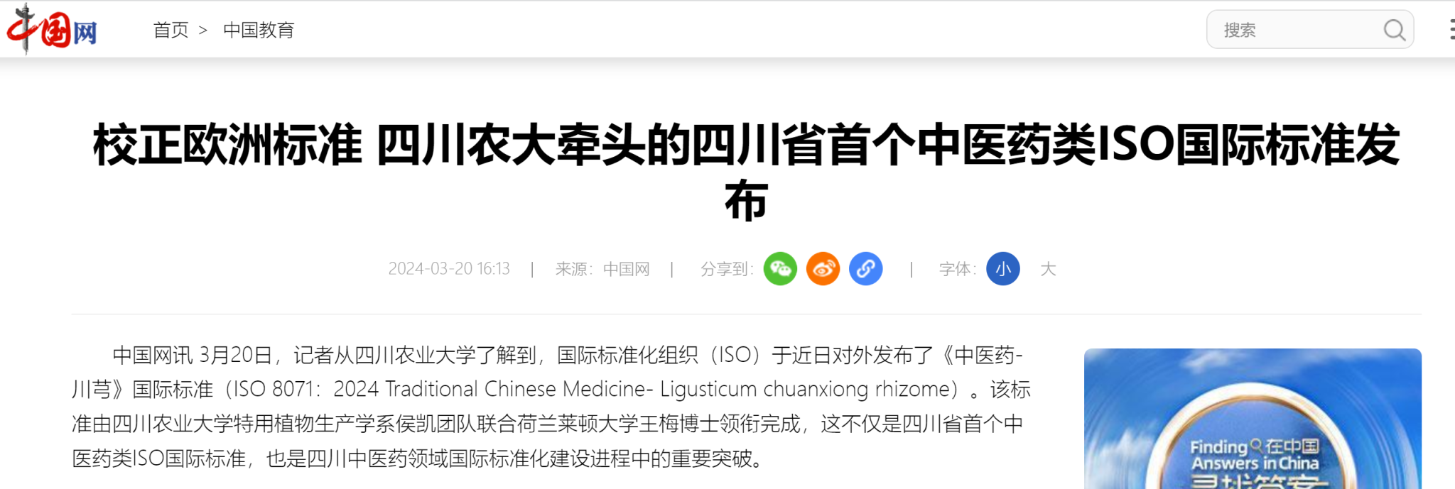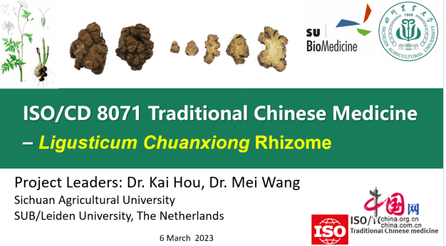 中国网讯 3月20日,记者从四川农业大学了解到,国际标准化组织(ISO)于近日对外发布了《中医药-川芎》国际标准(ISO 8071:2024 Traditional Chinese Medicine- Ligusticum chuanxiong rhizome)。该标准由四川农业大学特用植物生产学系侯凯团队联合荷兰莱顿大学王梅博士领衔完成,这不仅是四川省首个中医药类ISO国际标准,也是四川中医药领域国际标准化建设进程中的重要突破。
