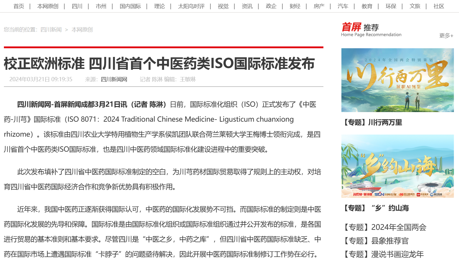 四川新闻网-首屏新闻成都3月21日讯(记者 陈淋)日前,国际标准化组织(ISO)正式发布了《中医药-川芎》国际标准(ISO 8071:2024 Traditional Chinese Medicine- Ligusticum chuanxiong rhizome)。该标准由四川农业大学特用植物生产学系侯凯团队联合荷兰莱顿大学王梅博士领衔完成,是四川省首个中医药类ISO国际标准,也是四川中医药领域国际标准化建设进程中的重要突破。