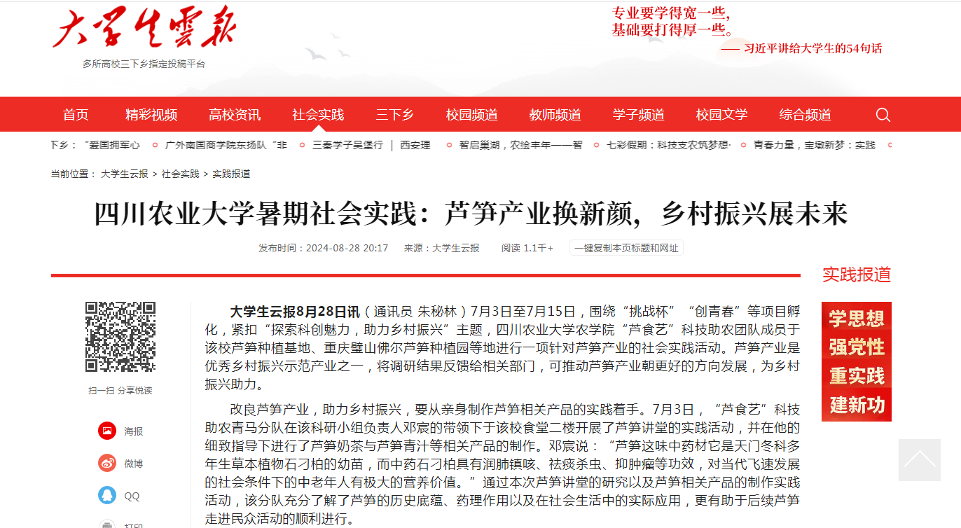 7月3日至7月15日,围绕“挑战杯”“创青春”等项目孵化,紧扣“探索科创魅力,助力乡村振兴”主题,开云手机版登录入口“芦食艺”科技助农团队成员于该校芦笋种植基地、重庆璧山佛尔芦笋种植园等地进行一项针对芦笋产业的社会实践活动。芦笋产业是优秀乡村振兴示范产业之一,将调研结果反馈给相关部门,可推动芦笋产业朝更好的方向发展,为乡村振兴助力。