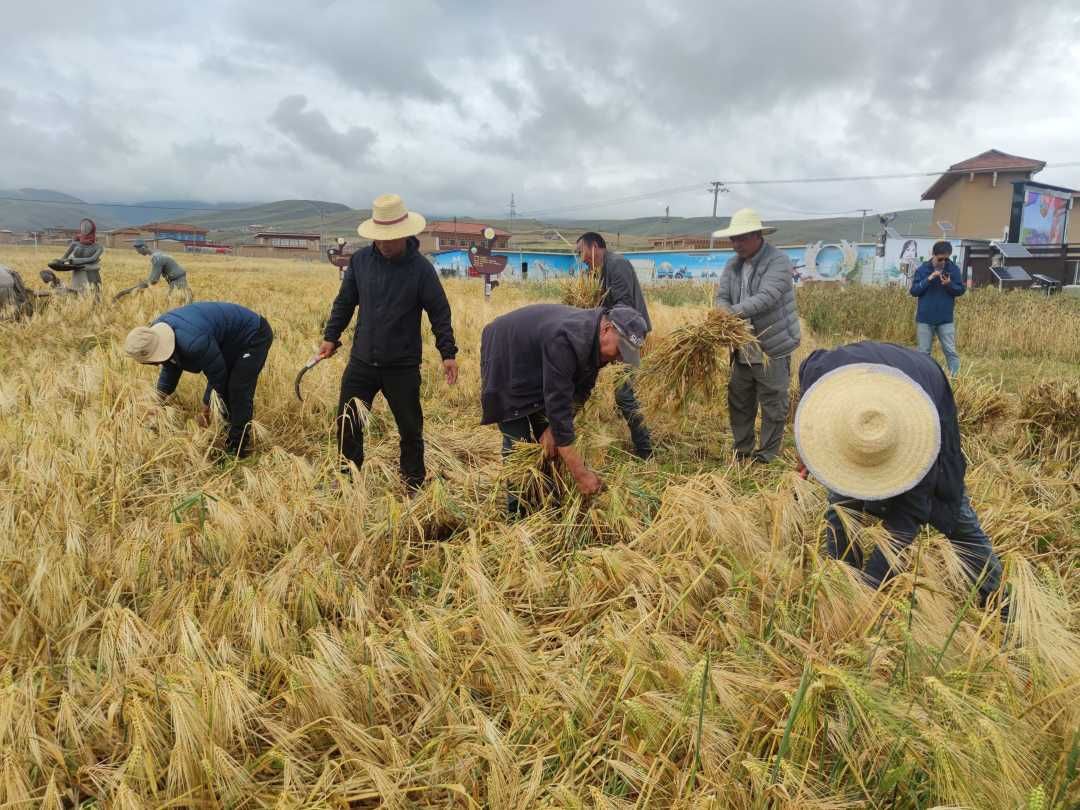 金黄色的青稞田中麦浪涌动,几个手持镰刀的农民正熟练地将一簇簇青稞割下堆在一旁。这些穗大垂首、籽粒饱满的青稞,如今正帮助一方百姓奔向美好生活。
