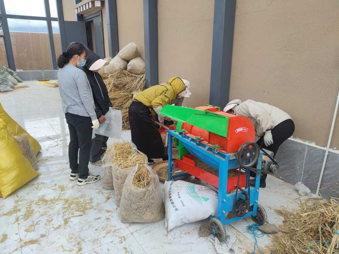 在距离园区试验田不远的地方,伫立着一座造型朴素的“青稞科技小院”。院内一间屋中传出阵阵机器的轰鸣声,走近一看,一袋袋青稞堆叠整齐,一旁的脱粒机正开足马力进行作业。