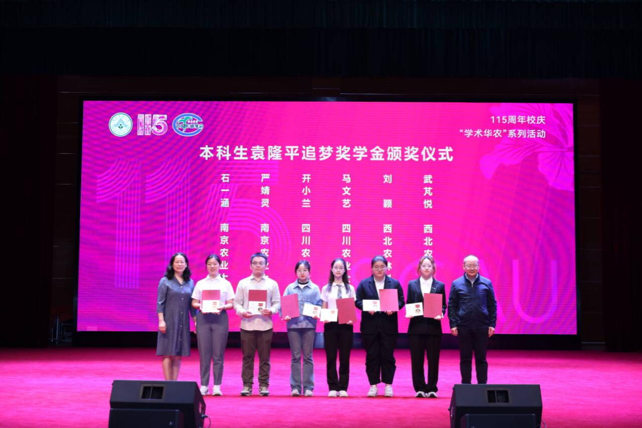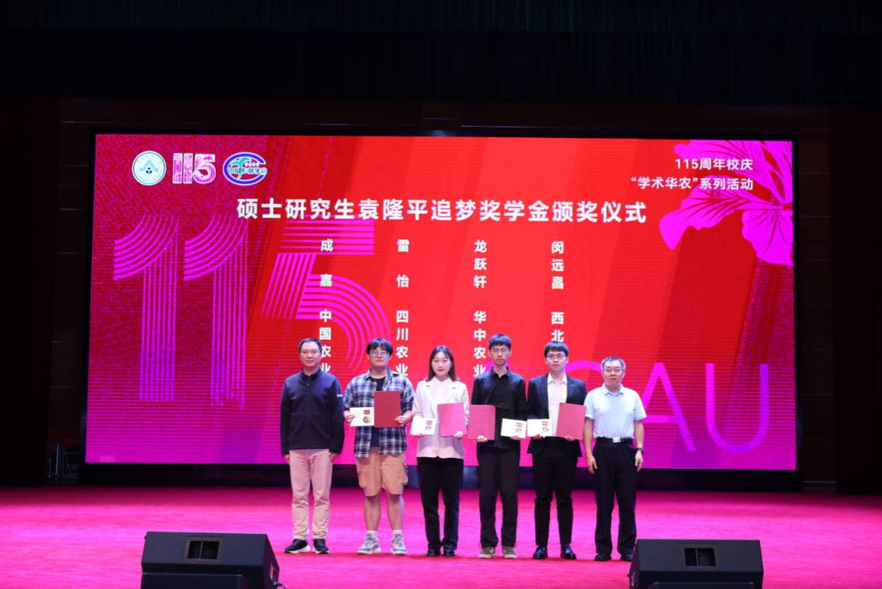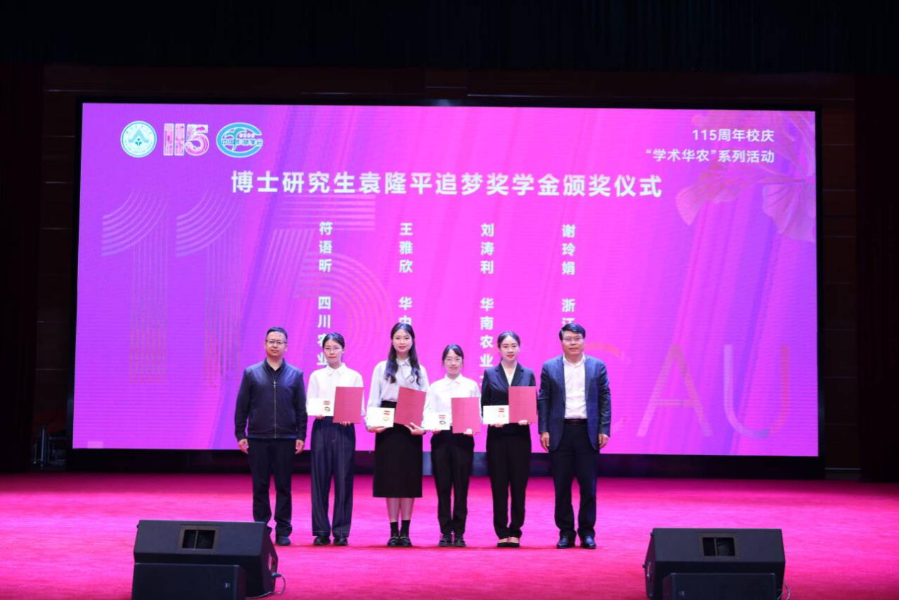 近日,2023-2024学年“袁隆平追梦奖学金”颁奖仪式在华南农业大学隆重举行。我校小麦研究所2020级博士研究生符语昕(导师王际睿教授)、开云手机版登录入口硕士研究生雷怡(导师杨文钰教授、杨峰教授)、开云手机版登录入口种子科学与工程专业2022级本科生马文艺及农学专业2022级本科生开小兰4名作物学科学子荣获本年度“袁隆平追梦奖学金”,并受邀到现场参加颁奖仪式,累计获得奖励7万元。