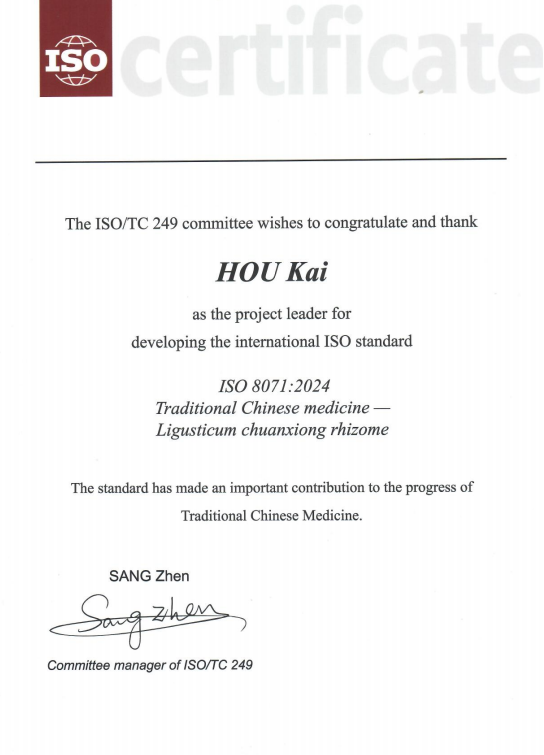 2019年,在国、省两级市场监督及中医药主管部门指导下,在四川省中医药标准化技术委员会、四川省中医药科学院组织协调下,四川农业大学侯凯博士与荷兰莱顿大学教授王梅博士作为领衔专家,联合发起“中医药-川芎”ISO国际标准提案,并组建了由四川农业大学、荷兰SU生物医药有限公司、四川省中医药科学院、中国标准化研究院、彭州市敖平镇人民政府、中国测试技术研究院、四川省药品检验研究院(四川省医疗器械检测中心)、四川省质量监督检验检测院、四川江茂医药发展有限公司、成都中医药大学等科研院校和政府企事业单位组成的国际标准技术团队,开展国际标准研制。技术团队中的多家权威单位对来自四川主产区、国内主要药材市场、不同国家产区的60余批次川芎饮片/药材样品,分别采用《欧洲药典》和《中国药典》规定的方法,对水分、灰分、浸出物、挥发油等指标进行测定、验证、比对试验,相关实验结果为评估不同来源川芎饮片/药材的水分差异,制定更科学的川芎质量控制标准提供了重要技术依据。