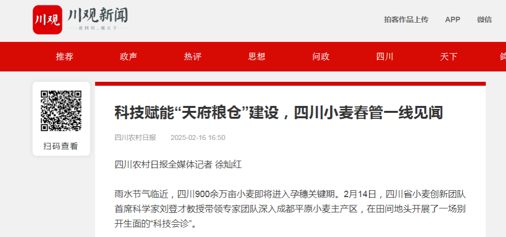 雨水节气临近,四川900余万亩小麦即将进入孕穗关键期。2月14日,四川省小麦创新团队首席科学家刘登才教授带领专家团队深入成都平原小麦主产区,在田间地头开展了一场别开生面的“科技会诊”。