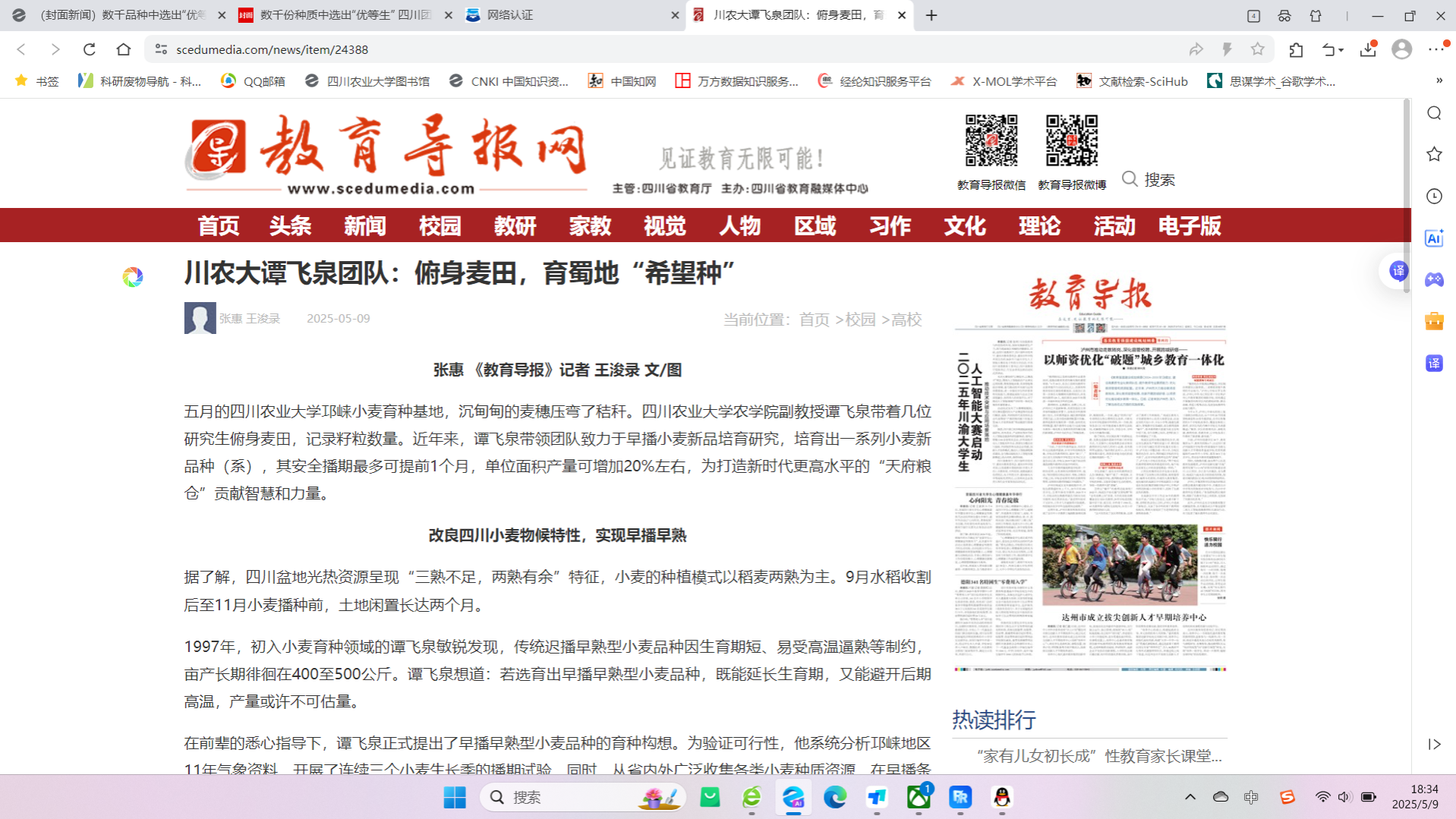 五月的四川农业大学邛崃小麦育种基地,沉甸甸的麦穗压弯了秸秆。开云手机版登录入口副教授谭飞泉带着几位研究生俯身麦田,记录籽粒数量。近年来,谭飞泉带领团队致力于早播小麦新品培育研究,培育出一系列小麦新品种(系),其安全播期最多可提前1个月,单位面积产量可增加20%左右,为打造新时代更高水平的“天府粮仓”贡献智慧和力量。