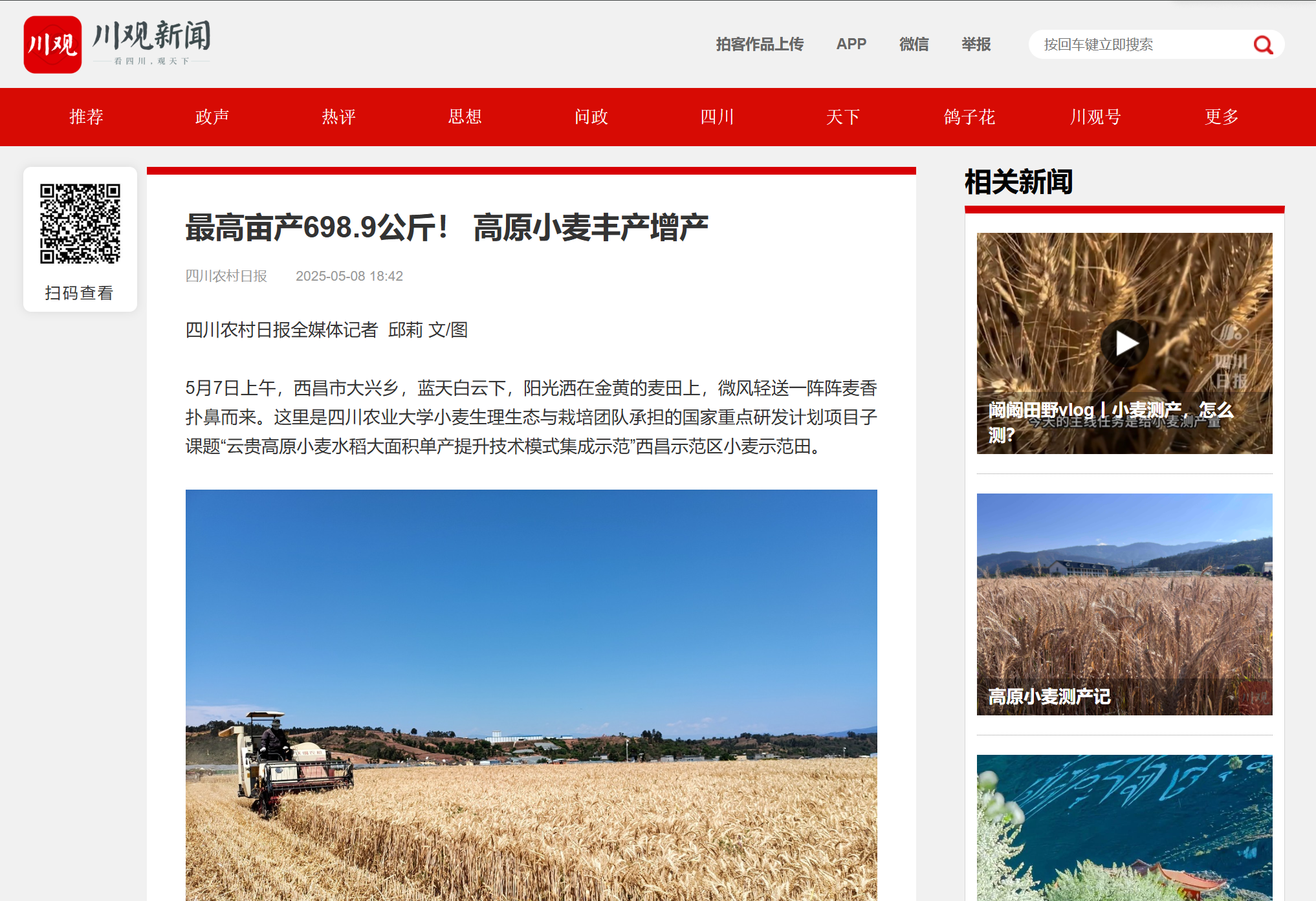 最高亩产698.9公斤,团队半年多的辛勤守护,终于丰收了。四川农业大学小麦栽培专家樊高琼向记者表示:“西昌地区的光热资源丰富,我们团队通过引进新品种、因地制宜创新高产栽培技术,并借助智能精量播种机实现足苗匀播,最终推动这次高产。”