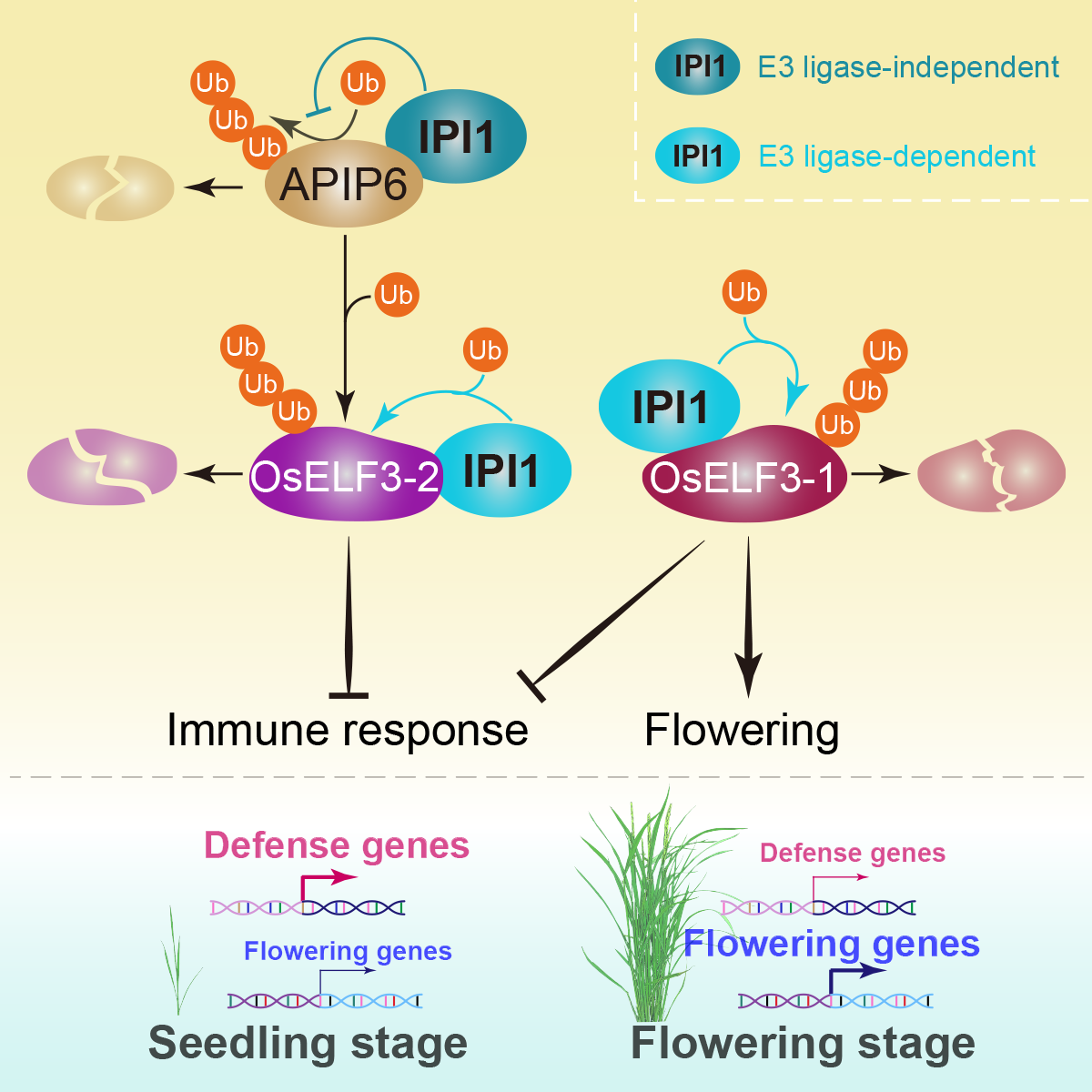 该研究解析了泛素连接酶IPI1协同调控水稻对稻瘟病的抗性和开花的分子机制,发现了泛素连接酶通过非泛素化修饰途径调控植物信号转导的新功能,为深入研究泛素连接酶平衡植物免疫和生长发育的机理奠定了基础。