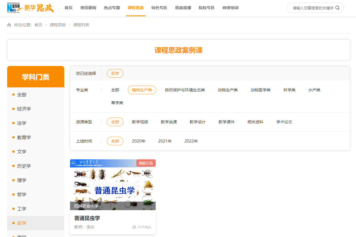 近日,我院植物保护学系李庆教授负责的国家级课程思政示范课《普通昆虫学》在“新华思政”——全国高校课程思政教学资源服务平台上线,面向全社会开放共享,截至目前,累计学习人数已达11000余人次。